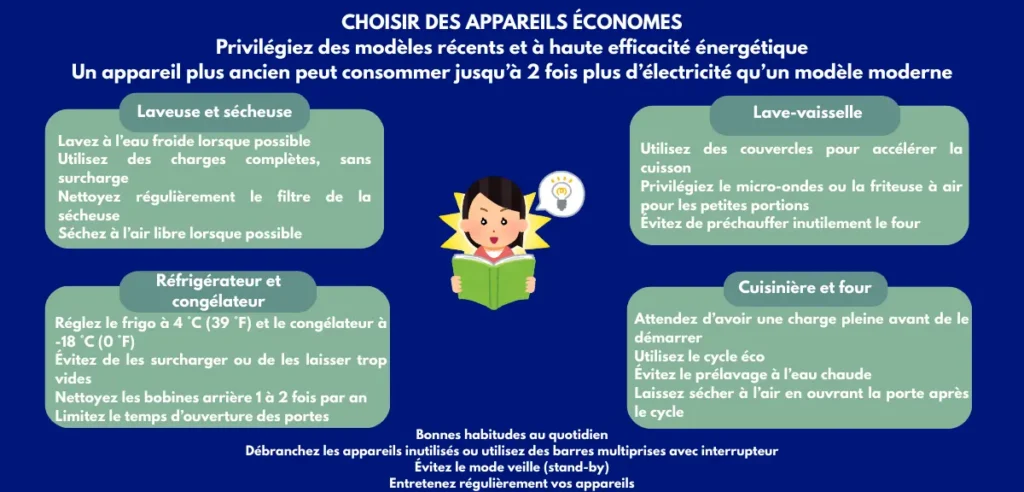 Éteindre les appareils inutilisés, éviter les cycles intensifs et nettoyer régulièrement les composantes sont des habitudes simples qui font une vraie différence. Adapter l’utilisation des électroménagers à ses besoins réels permet de réduire la consommation sans sacrifier le confort.