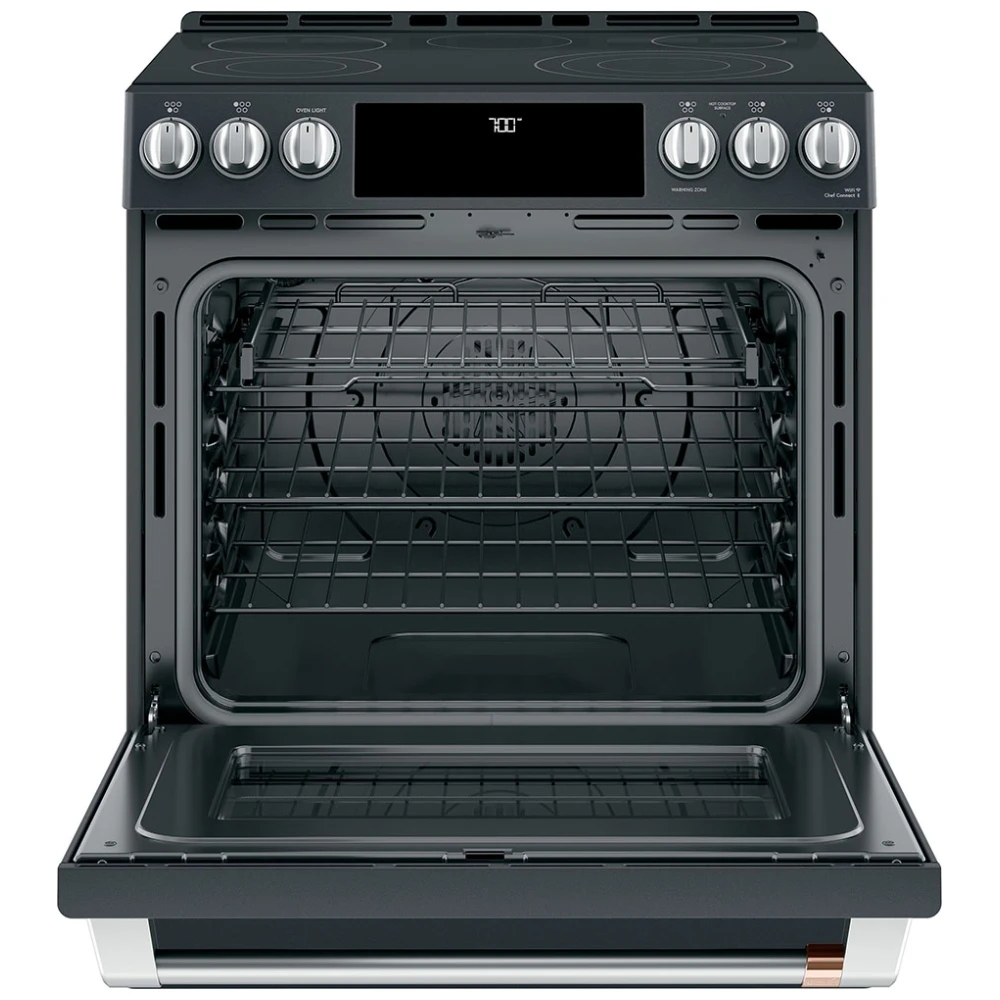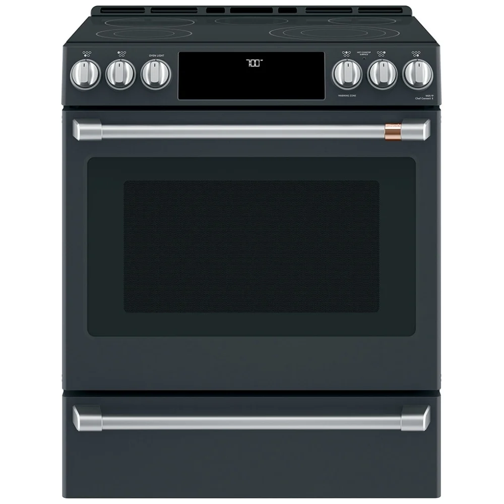 La cuisinière électrique GE Café CCES700P3MD1 de 30 pouces combine performance avancée et design sophistiqué en noir mat. Avec son four de 5,7 pi³ à convection européenne véritable, sa fonction friture à air chaud et son élément puissant de 3 600 watts, elle est conçue pour offrir une cuisson précise et polyvalente.
