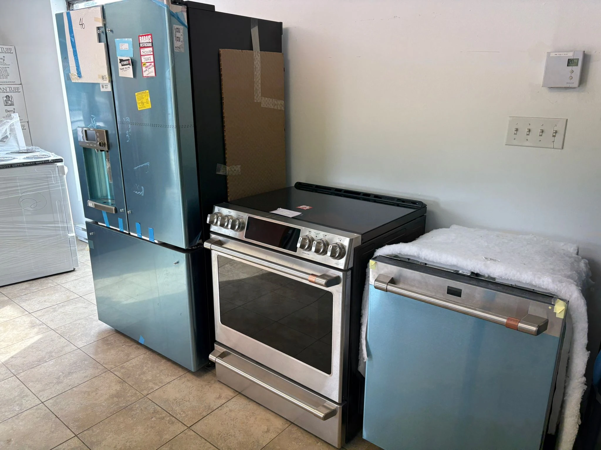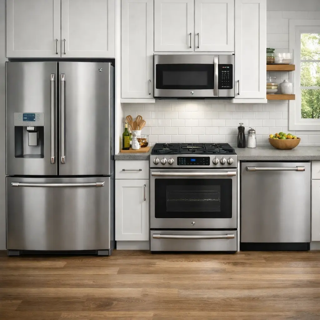 Le trio de cuisine GE Café en acier inoxydable est une solution complète haut de gamme comprenant un réfrigérateur à portes françaises, une cuisinière électrique et un lave-vaisselle encastré. Cet ensemble est idéal pour une cuisine moderne recherchant performance, design uniforme et technologie avancée.