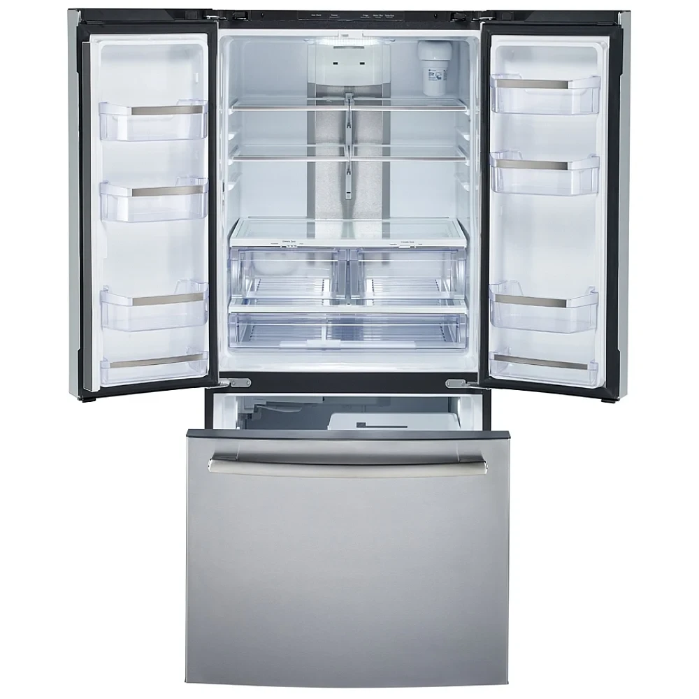 Le réfrigérateur utilise une configuration à portes françaises. Ainsi, l’accès aux aliments frais demeure simple et rapide.