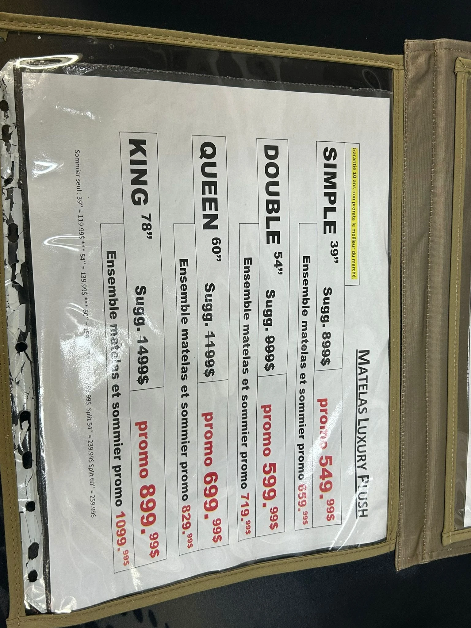 L’ensemble matelas et sommier à 659,99 $. - Double (54″) : 599,99 $
