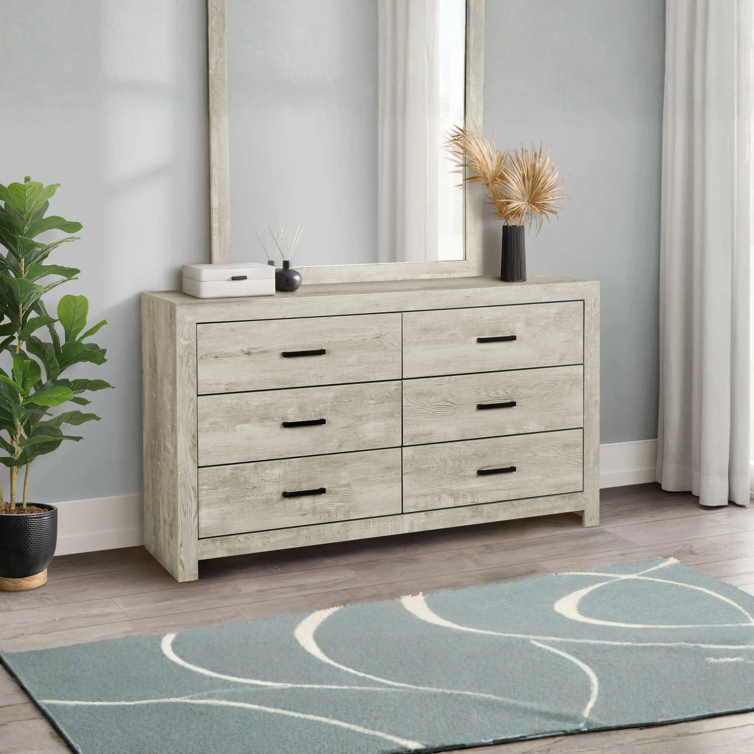 La commode offre 6 tiroirs spacieux pour organiser vêtements et accessoires. Les tiroirs utilisent une construction à queues d’aronde reconnue pour sa solidité. Les poignées métalliques noires ajoutent également une touche moderne.
