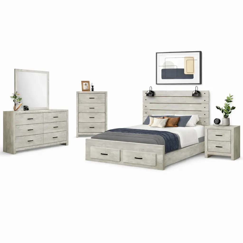 Cet ensemble comprend un lit queen avec rangement et ports USB, une commode 6 tiroirs, une commode 4 tiroirs, une table de chevet 2 tiroirs et un miroir mural assorti. Ainsi, vous pouvez aménager une chambre complète avec un style uniforme.