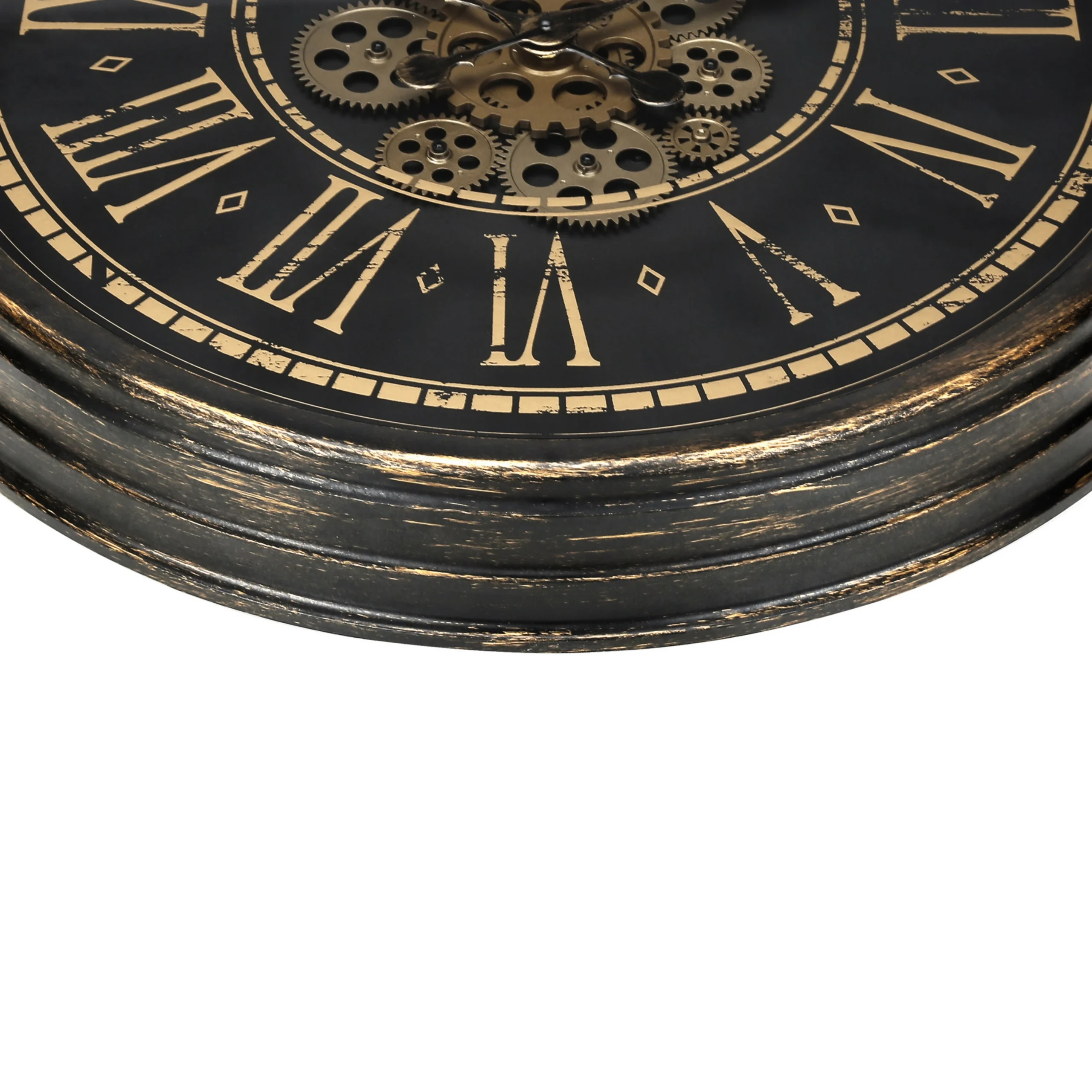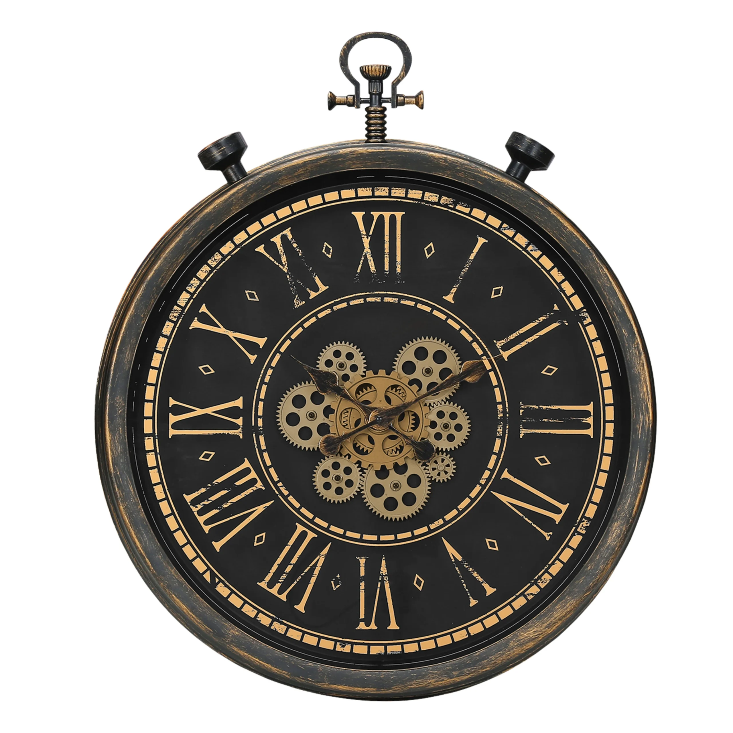 Le cadre brun vieilli avec accents dorés met en valeur le mécanisme d’engrenages visible. Ainsi, cette horloge devient rapidement un élément central dans une pièce.