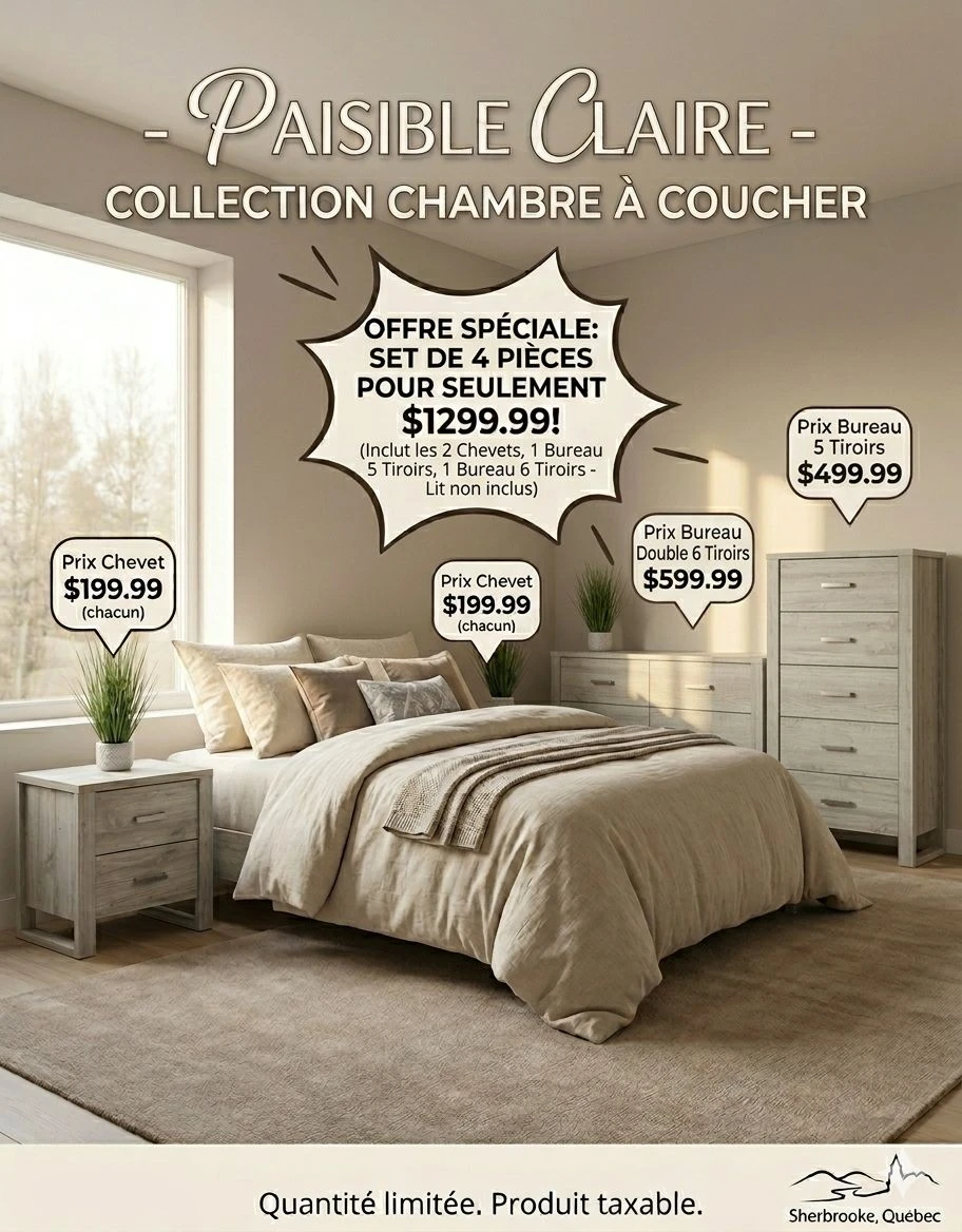 Transformez votre chambre en un espace élégant, chaleureux et conçu pour durer avec ce set de chambre, fièrement fabriqué au Québec. Cette collection se distingue par sa qualité de construction supérieure combinant bois massif, placage massif et mélamine thermocollée, offrant une excellente résistance à l’usure quotidienne.