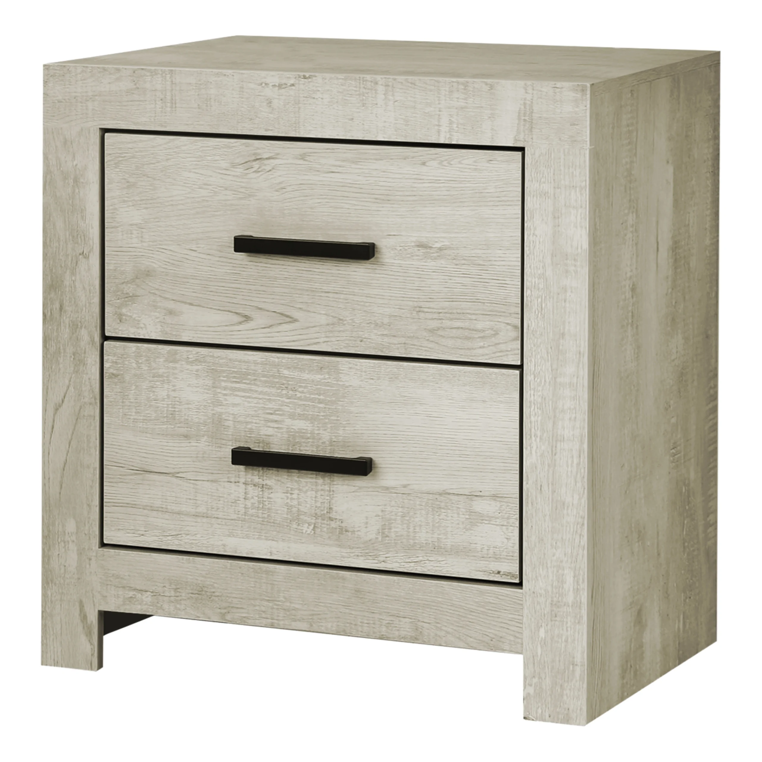 Les deux tiroirs offrent un rangement pratique pour garder livres, accessoires ou objets personnels à portée de main. De plus, les poignées métalliques noires ajoutent une touche élégante qui complète le design.Ainsi, cette table de chevet devient un meuble fonctionnel et décoratif à côté du lit.